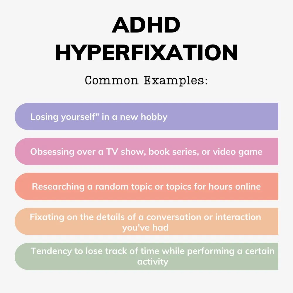 ADHD fixation—or hyperfixation— “refers to an intense and prolonged interest in or obsession with a certain activity, subject, or person.” (Read More)