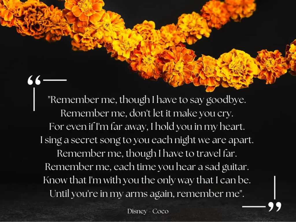 - “Remember me, though I have to say goodbye. Remember me, don’t let it make you cry. For even if I’m far away, I hold you in my heart. I sing a secret song to you each night we are apart. Remember me, though I have to travel far. Remember me, each time you hear a sad guitar. Know that I’m with you the only way that I can be. Until you’re in my arms again, remember me”. – Coco, Disney